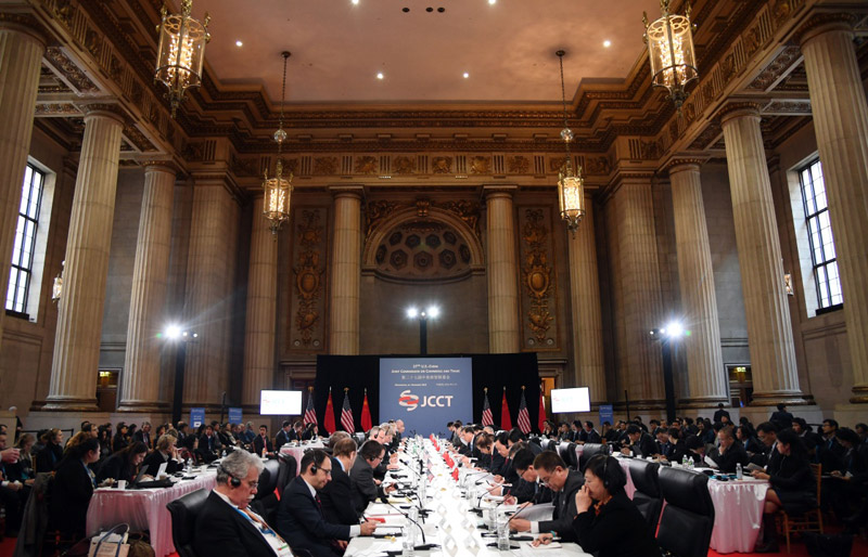 11月21日至23日,第27届中美商贸联委会在美国首都华盛顿举行。中国国务院副总理汪洋与美国商务部长普里茨克、贸易代表弗罗曼共同主持。美国农业部长维尔萨克与会。这是11月23日拍摄的中美商贸联委会会场。新华社记者殷博古摄