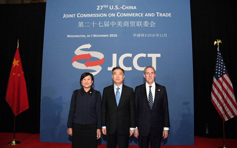 11月23日,在美国首都华盛顿,中国国务院副总理汪洋和美国商务部长普里茨克(左)、贸易代表弗罗曼出席第27届中美商贸联委会时合影。第27届中美商贸联委会21日至23日在华盛顿举行。中国国务院副总理汪洋与美国商务部长普里茨克、贸易代表弗罗曼共同主持。美国农业部长维尔萨克与会。新华社记者 殷博古 摄
